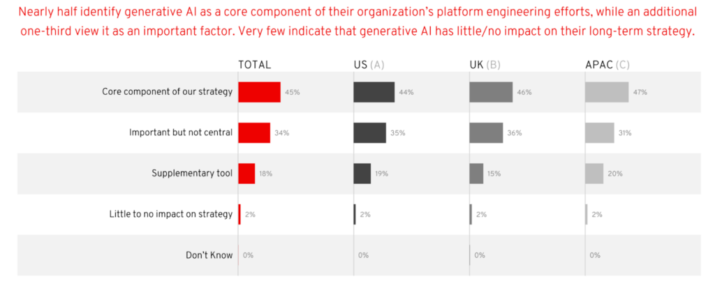 La IA generativa está ganando protagonismo en las estrategias de ingeniería de plataformas. Según el informe, el 34% de las organizaciones considera que la IA generativa es un elemento importante de su estrategia, mientras que el 45% la califica como fundamental.