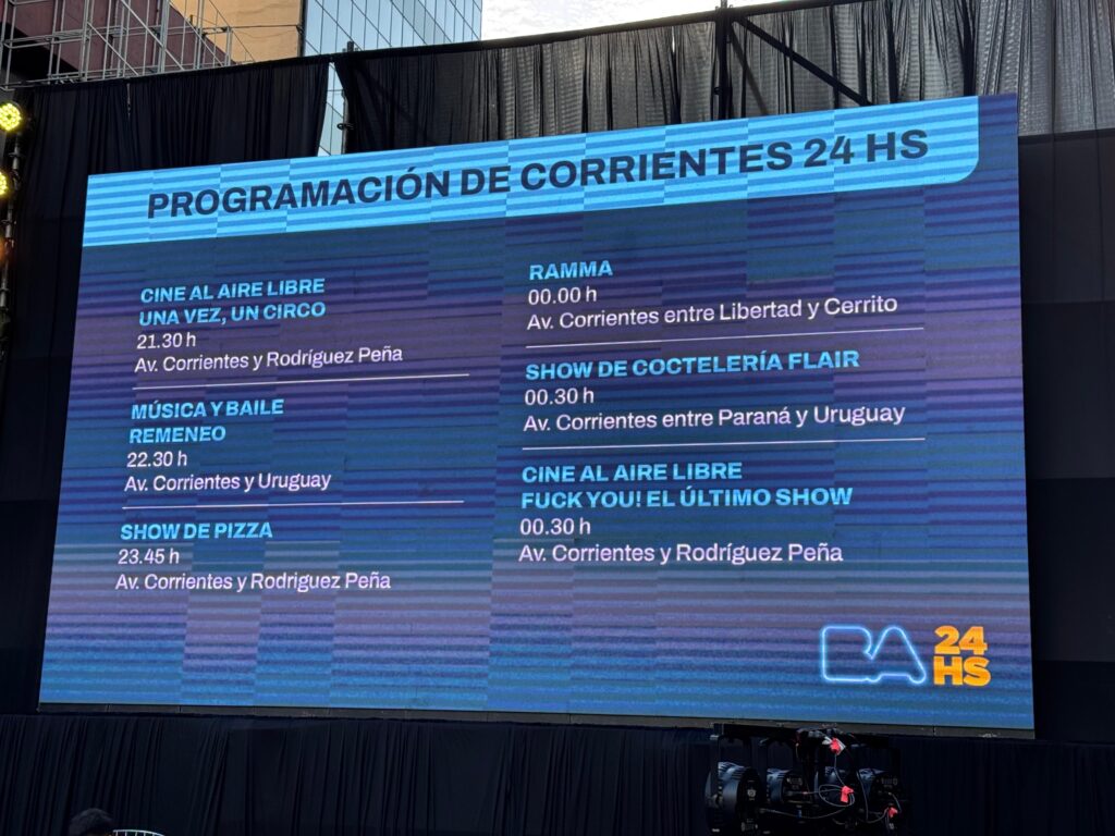 Corrientes 24 horas está organizado por el Gobierno porteño a través de los ministerios de Desarrollo Económico y Cultura, y tiene como objetivo impulsar la economía nocturna y reforzar el rol cultural, gastronómico y comercial de una de las avenidas con mayor historia de la Ciudad. Y dentro del plan Buenos Aires 24 horas, se refuerza la seguridad en la avenida y los operativos de control y el refuerzo de la higiene urbana.